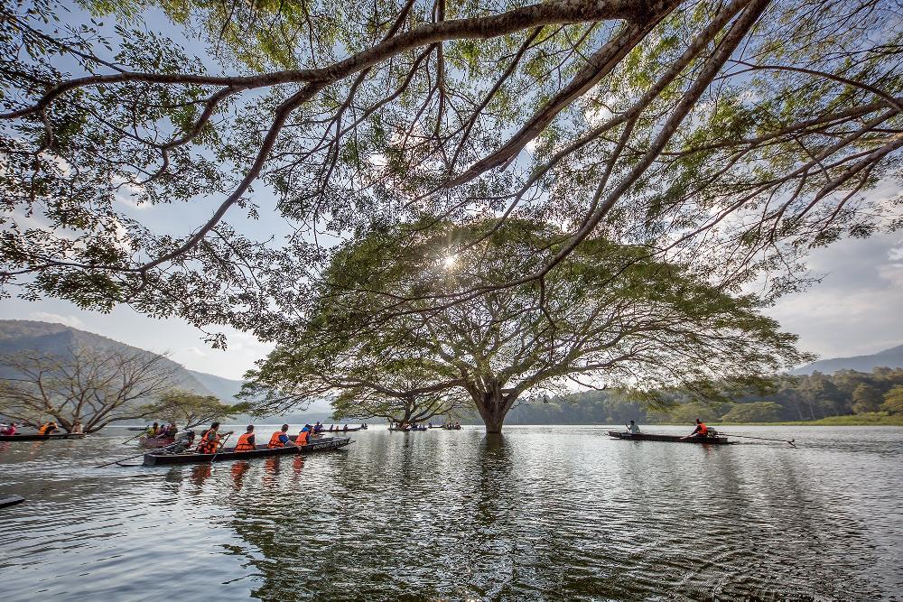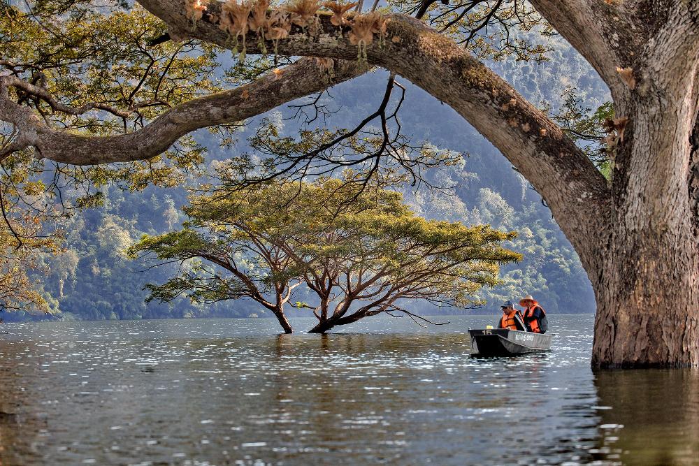 Eine der ungewöhnlichsten – und fotogensten – Attraktionen sind mehrere riesige Regenbäume (Samanea saman), die mitten im Wasser stehen. Diese majestätischen Bäume gelten als rund 100 Jahre alt und waren also schon da, lange bevor der Stausee entstand. Seitdem stehen ihre Wurzeln und unteren Stammteile fast dauerhaft unter Wasser – ein botanisches Kuriosum.Dass diese Baumart eine jahrzehntelange Überstauung überlebt hat, ist erstaunlich. Normalerweise reagieren viele Bäume empfindlich auf dauerhaft nasse Wurzeln, doch Samanea saman scheint erstaunlich widerstandsfähig zu sein. Die breiten Kronen, die sich wie grüne Schirme über dem Wasser ausbreiten, machen die Szenerie fast surreal.