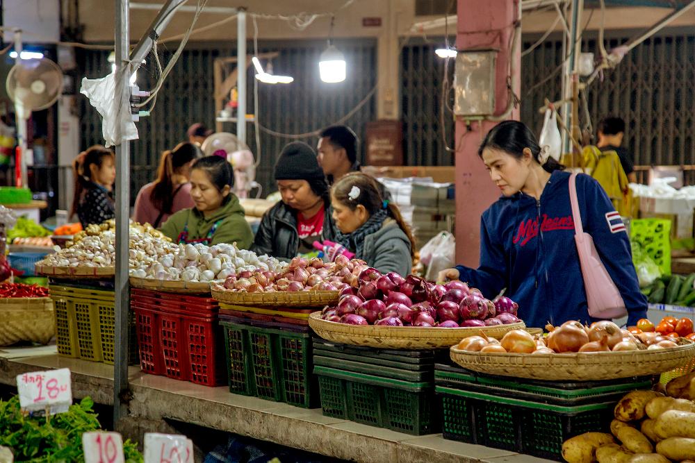 Das Angebot ist entsprechend ehrlich: dampfende Nudelsuppen, Currys in allen Schärfegraden, gegrilltes Fleisch, Klebreis, fermentiertes Gemüse und Snacks, die man selten südlich von Chiang Rai findet. Viele Stände werden von älteren Frauen betrieben, die keine Lust auf Erklärungen haben – man zeigt auf den Topf, bekommt eine Schüssel, setzt sich. Fertig. Geschmacklich bewegt sich das Ganze klar im nordthailändisch-shanischen Grenzraum, mit Einflüssen aus Myanmar und Südchina, oft rustikaler, herzhafter und weniger süß als im Rest des Landes.