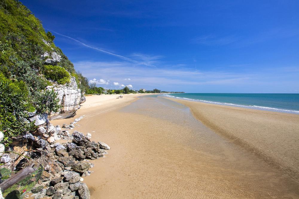 Der Khao Kalok Beach zieht sich über mehrere Kilometer entlang der Küste und endet am gleichnamigen Hügel – dem „Schädelberg“, wie ihn die Einheimischen nennen. Der Name klingt düster, aber keine Sorge: Statt Knochen und Grusel gibt’s hier Sonne, Sand und eine Aussicht, die einem glatt die Sprache verschlägt.