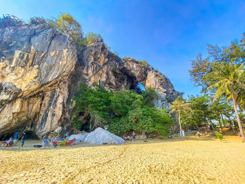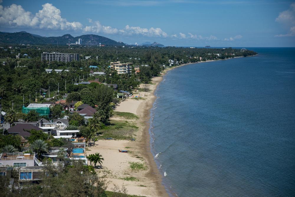 Der Felsen, der dem Strand seinen Namen gibt, sieht aus wie ein gigantischer Schädel aus Stein. Ein schmaler Pfad führt hinauf – etwa 20 Minuten moderate Kletterei – und oben erwartet einen ein Panoramablick über das Meer, die Bucht von Pak Nam Pran und die dahinterliegenden Hügelketten. Wenn die Sonne langsam über dem Golf von Thailand versinkt, ist das einer dieser Momente, in denen man unwillkürlich denkt: Genau deshalb bin ich hier.