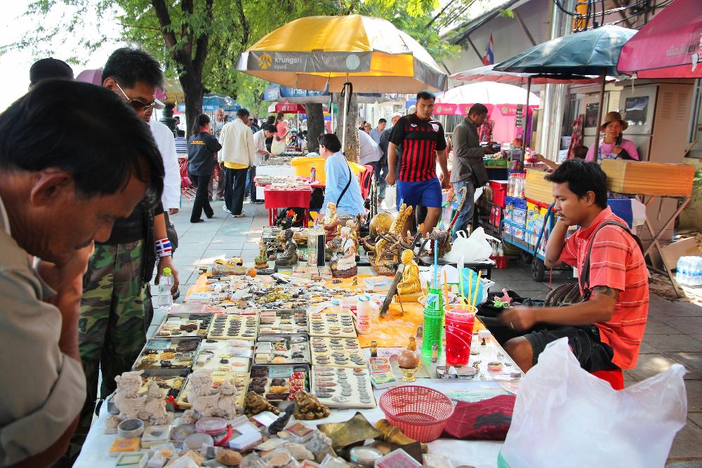 Was viele nicht wissen: Hinter der Spiritualität steckt ein Wirtschaftszweig mit beachtlichem Volumen. Der thailändische Amulettmarkt hat einen jährlichen Umsatz von rund 6 Milliarden Baht (etwa 150 Millionen Euro). Es gibt spezialisierte Händler, Auktionshäuser, sogar Hochglanzmagazine – quasi das Pendant zu unseren Münz- oder Briefmarkensammlern. Nur dass es hier nicht um Hobbys geht, sondern um Karma-Investments.Gleich neben dem Wat Mahathat, zwischen Flussufer und Königspalast, reihen sich hier unzählige kleine Stände aneinander, dicht gedrängt wie in einem goldglänzenden Basar des Glaubens. Auf wackeligen Tischen liegen winzige Buddhafiguren, heilige Rollen, Talismane aus Knochen, Ton und Metall – manche alt, manche neu, manche fragwürdig.