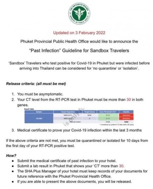 Das Gesundheitsamt der Provinz Phuket (PPHO) kündigte in einer Bekanntmachung am am 3. Februar 2022 an, die als "Past Infection Guideline for Sandbox Travelers" bezeichnet wird. Die Behörden von Phuket haben die Maßnahme jedoch noch nicht über die üblichen Regierungskanäle bekannt gegeben.