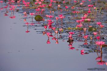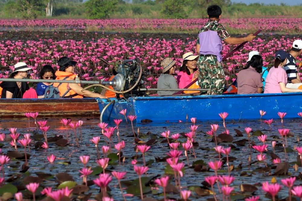 Zahlreiche Besucher strömen zum wunderschönen Bueng Boraphet in Nakhon Sawan, um die Schönheit eines Meeres aus blühenden rosa Lotos zu bewundern, die ab November/Dezember bei kühlem Wetter eine Fläche von mehr als 100 Rai (160.000 qm) bedecken. Je nach Jahreszeit und Wetter vergössert sich der sehr flache See, um ein Vielfaches seiner Grösse, die er in der Trockenzeit inne hat.