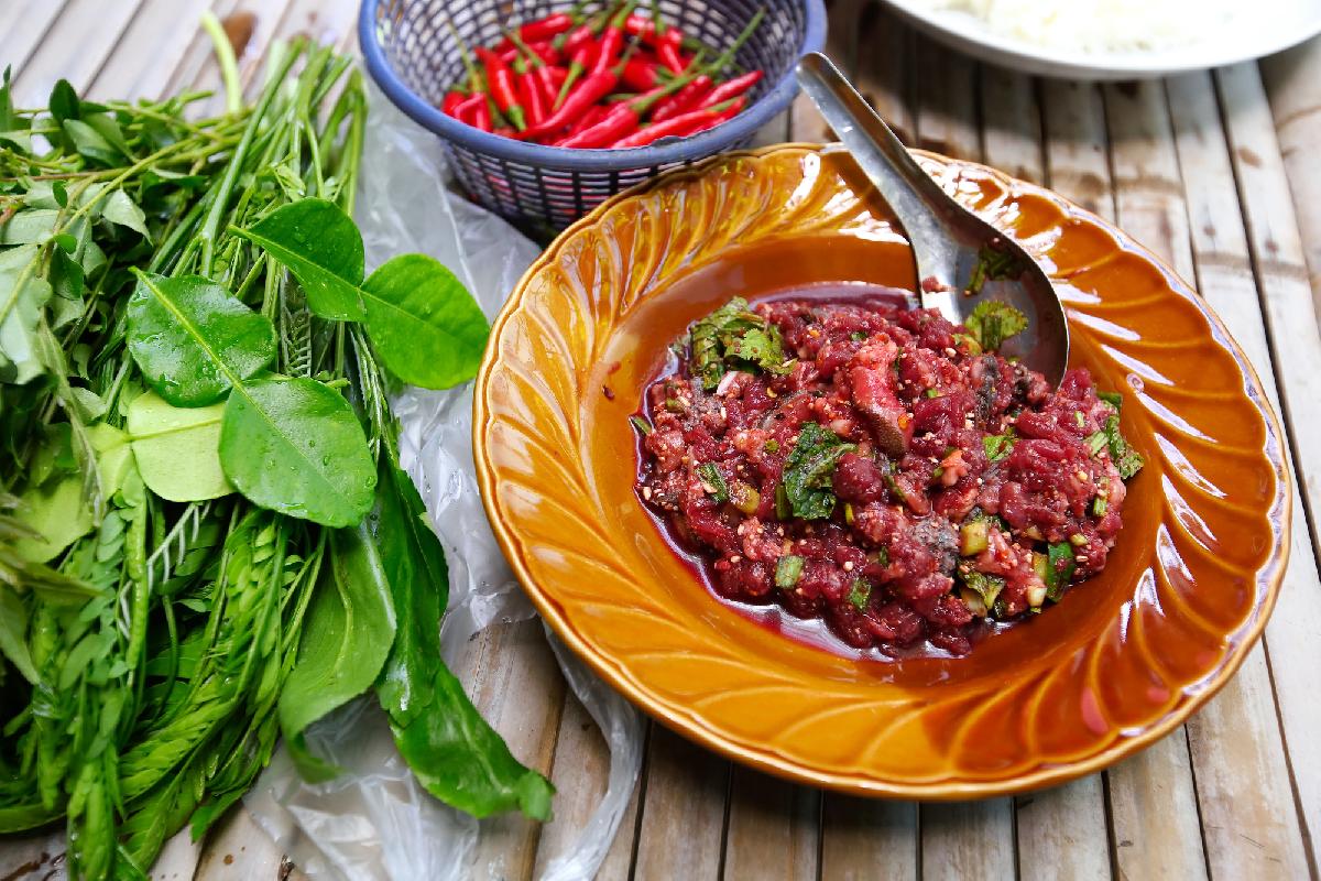 Die rohe Variante von Larb (dem bekannten Hackfleischsalat). Hier wird das Fleisch – meist Rind oder Schwein – nicht gegart, sondern nur mit Gewürzen, Limette und Chili vermischt.Luu (หลู้เลือด)