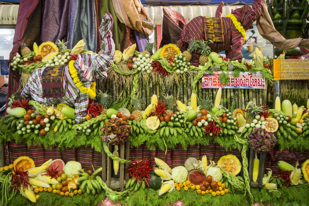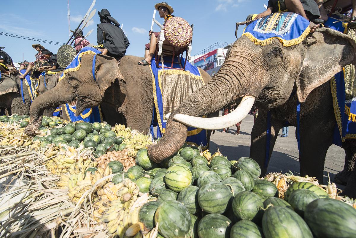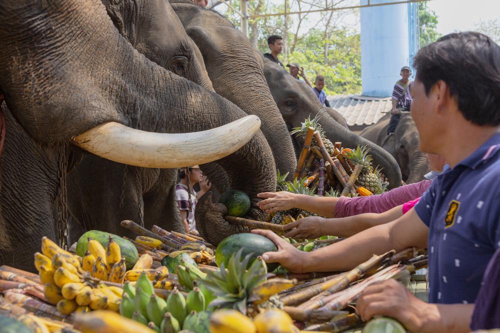 Bei den Feiern nehmen oft Dutzende Elefanten teil, die riesige Obst- und Gemüsebuffets genießen – ein beliebtes Fotomotiv für Besucher.