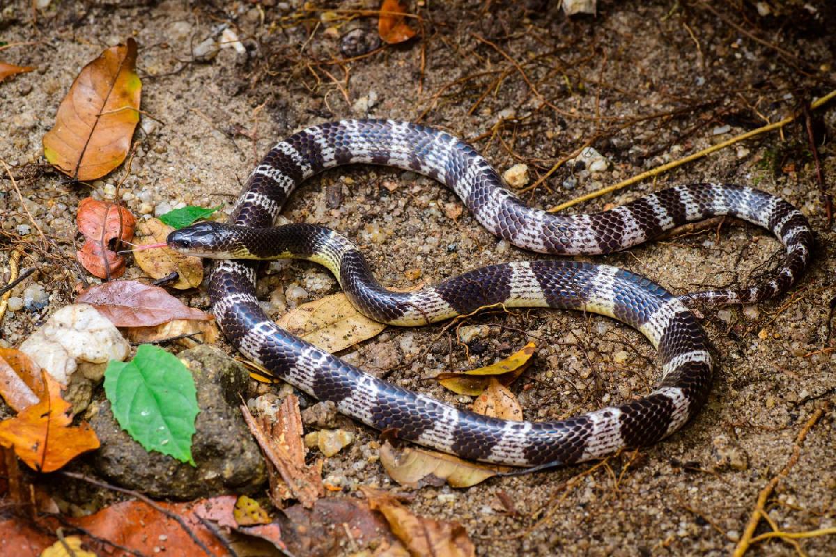 Die Malaiische Krait (Bungarus candidus) gehört zu den gefährlichsten Giftschlangen Südostasiens – und ist auch in Thailand weit verbreitet. Im Vergleich zur auffällig gebänderten Krait wirkt sie zunächst etwas dezenter, doch ihre schwarz-weißen Querbänder sind ebenso deutlich erkennbar. Trotz ihrer eleganten Erscheinung zählt sie medizinisch zu den bedeutendsten Schlangenarten der Region.Mit einer Länge von meist ein bis anderthalb Metern ist sie schlank gebaut und besitzt einen glänzend schwarzen Körper mit schmalen weißen oder hellgrauen Bändern. Ihr Kopf ist kaum vom Hals abgesetzt, die Augen wirken relativ klein. Charakteristisch ist der glatte, fast lackierte Schuppenglanz, der sie im Licht leicht schimmern lässt.