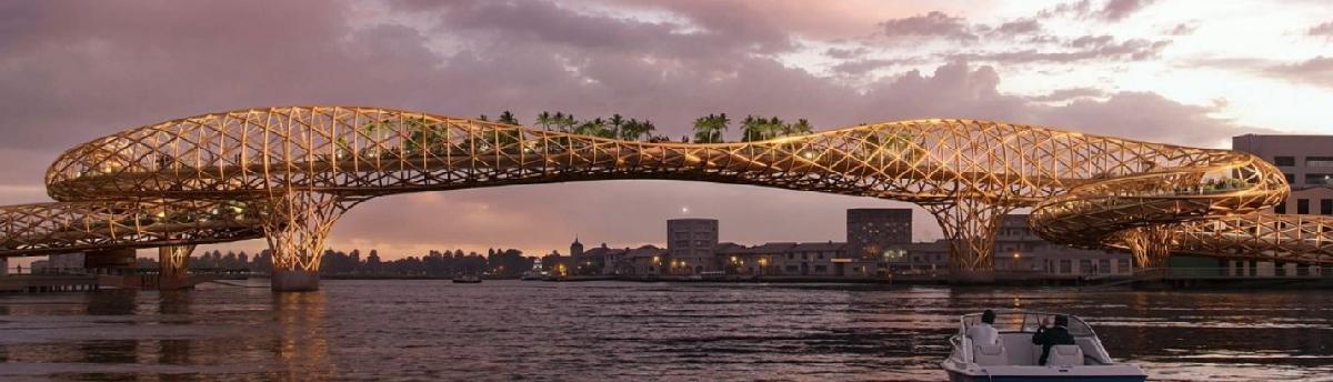 Was die BMA präsentiert hat, ist weit mehr als eine nüchterne Verkehrsbrücke. Der Entwurf zeigt eine moderne, skulpturale Struktur aus goldfarbenem Metall, gebildet aus einem filigranen Gitter aus diagonal verflochtenen Streben. Diese halb offene Hülle umschließt den Gehweg und wirkt zugleich als Schattenspender – ein cleveres Detail im tropischen Klima Bangkoks.Die Dichte des Metallgeflechts variiert entlang der Brücke: dichtere Bereiche filtern die intensive Sonne, offenere Abschnitte lassen Wind vom Fluss durchziehen. Nachts sorgen integrierte, unsichtbar verbaute Lichtquellen für eine stimmungsvolle Beleuchtung, ohne die klare Form zu stören.