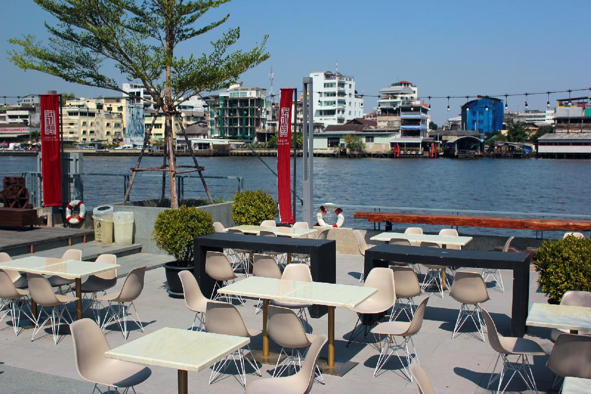 Besonders auffällig ist der aufgeweitete Mittelbereich der Brücke. Dort entsteht eine kleine öffentliche Plaza mit Stufen, Sitzflächen aus Holz und bepflanzten Terrassen. Diese Zone unterbricht bewusst den linearen Weg und lädt dazu ein, stehen zu bleiben, den Blick über den Fluss schweifen zu lassen oder Fotos zu machen. Der Wasserstand des Chao Phraya bleibt sichtbar – die Gestaltung hält die visuelle Verbindung zur Strömung bewusst offen.