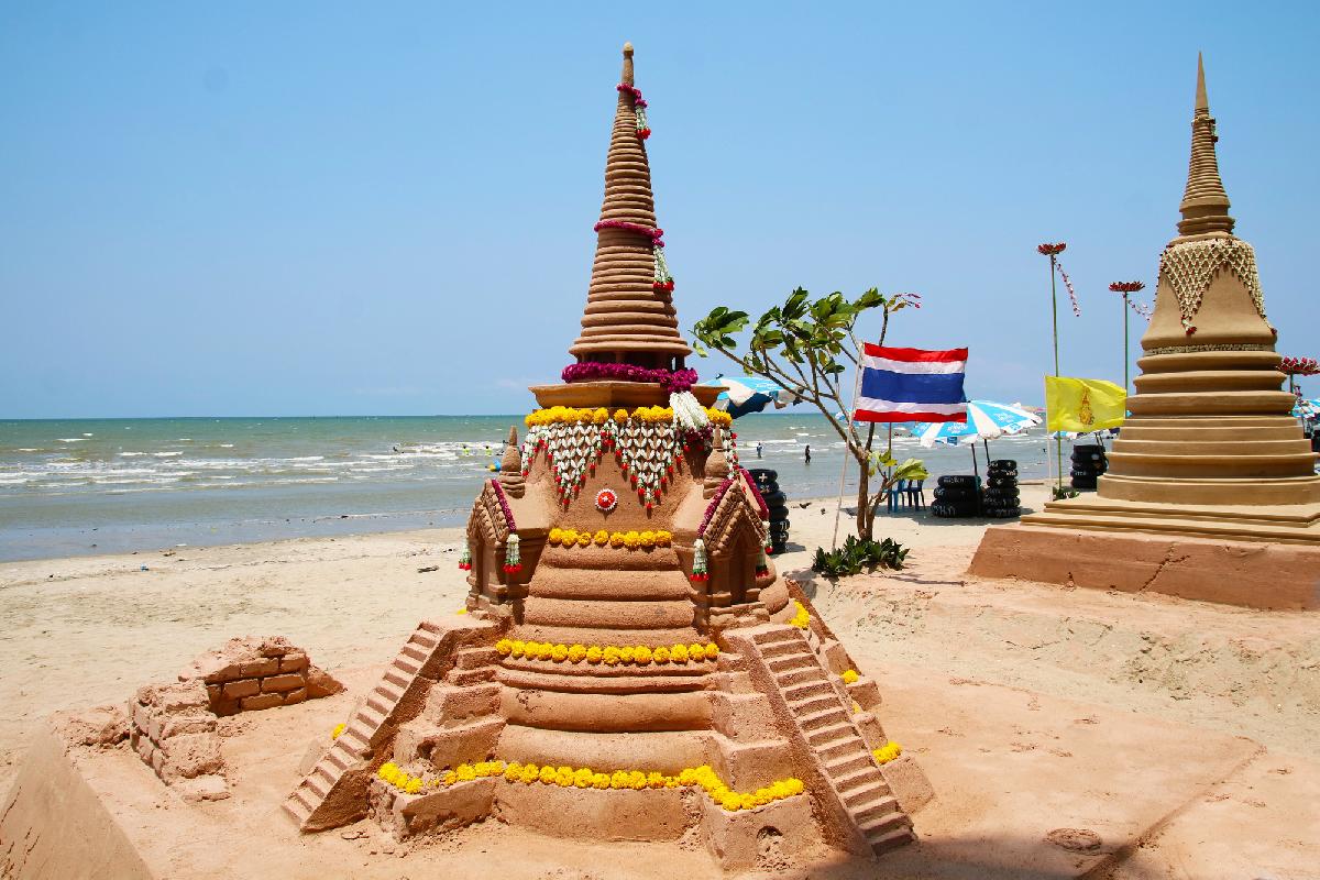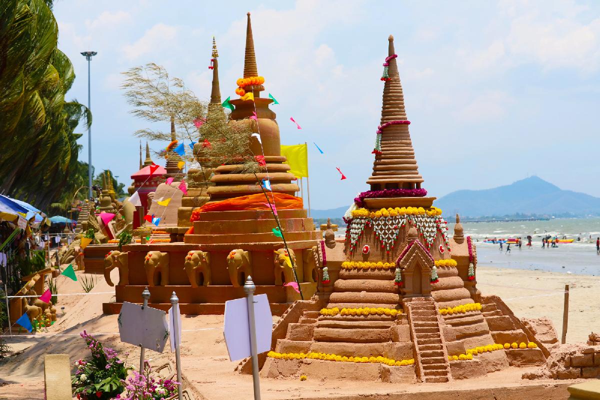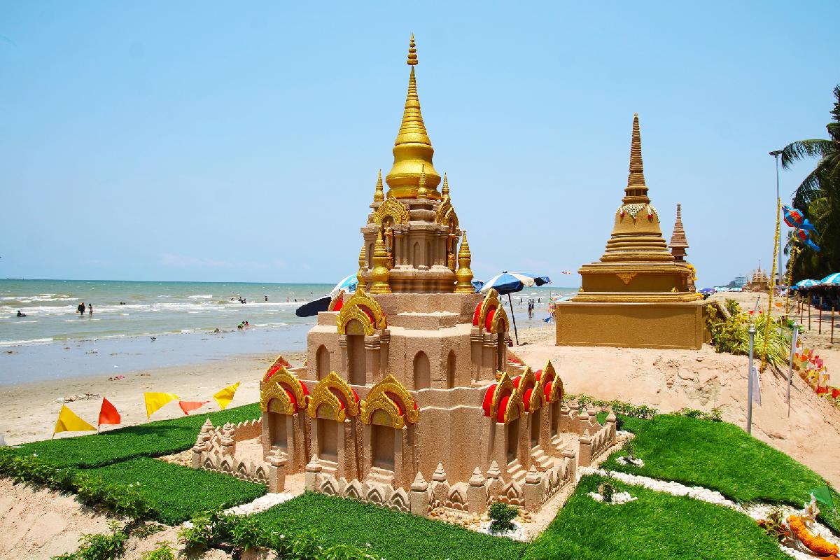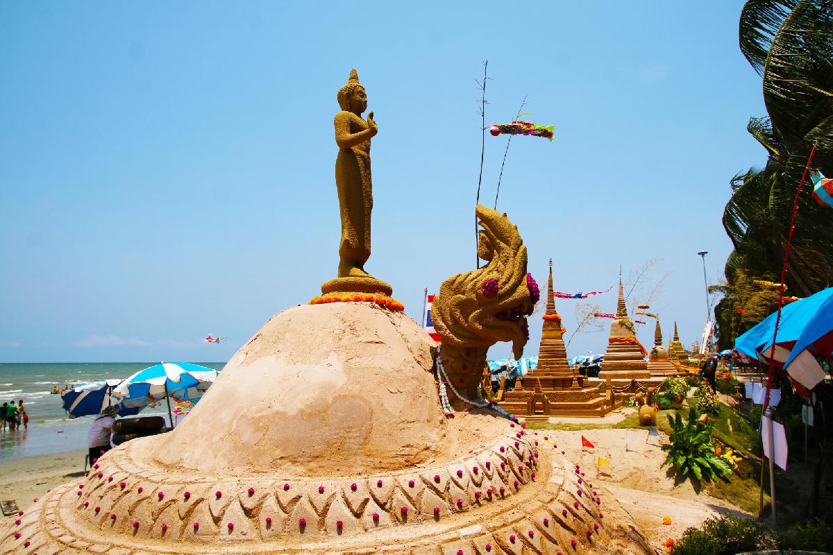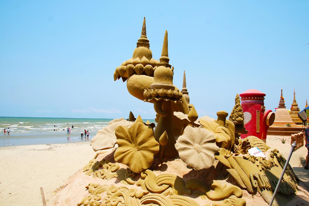Die Künstler, die hier arbeiten, kommen teilweise aus ganz Thailand, manchmal auch aus dem Ausland. Tage- oder wochenlang wird geschaufelt, modelliert und gefeilt, bis aus einem einfachen Sandhaufen ein Kunstwerk entsteht, das plötzlich lebendig wirkt. Und genau das ist der Moment, in dem Besucher stehen bleiben und sich fragen, wie lange so etwas wohl hält. Die ehrliche Antwort ist: nicht ewig. Wind, Sonne und die nächsten Gezeiten sorgen irgendwann dafür, dass alles wieder verschwindet. Vielleicht ist genau das ein Teil des Reizes.