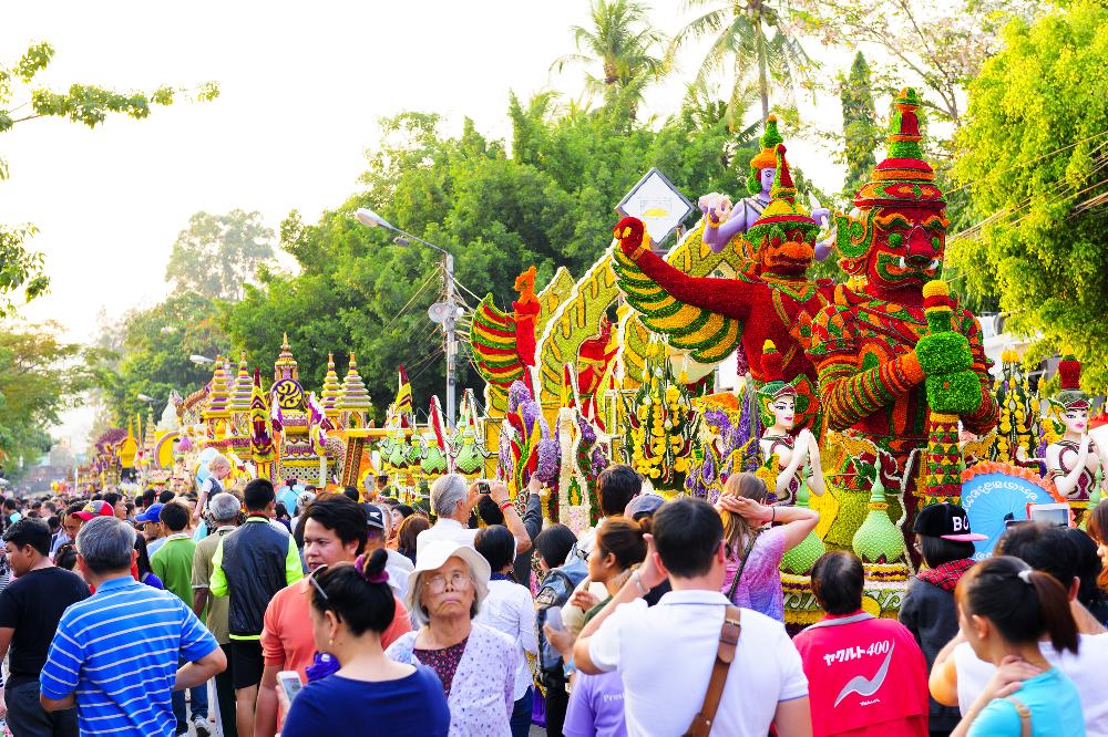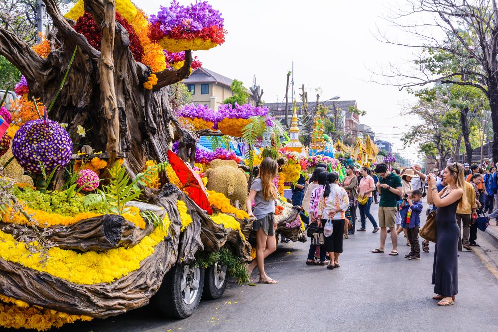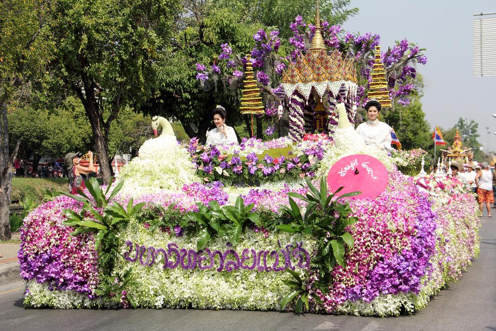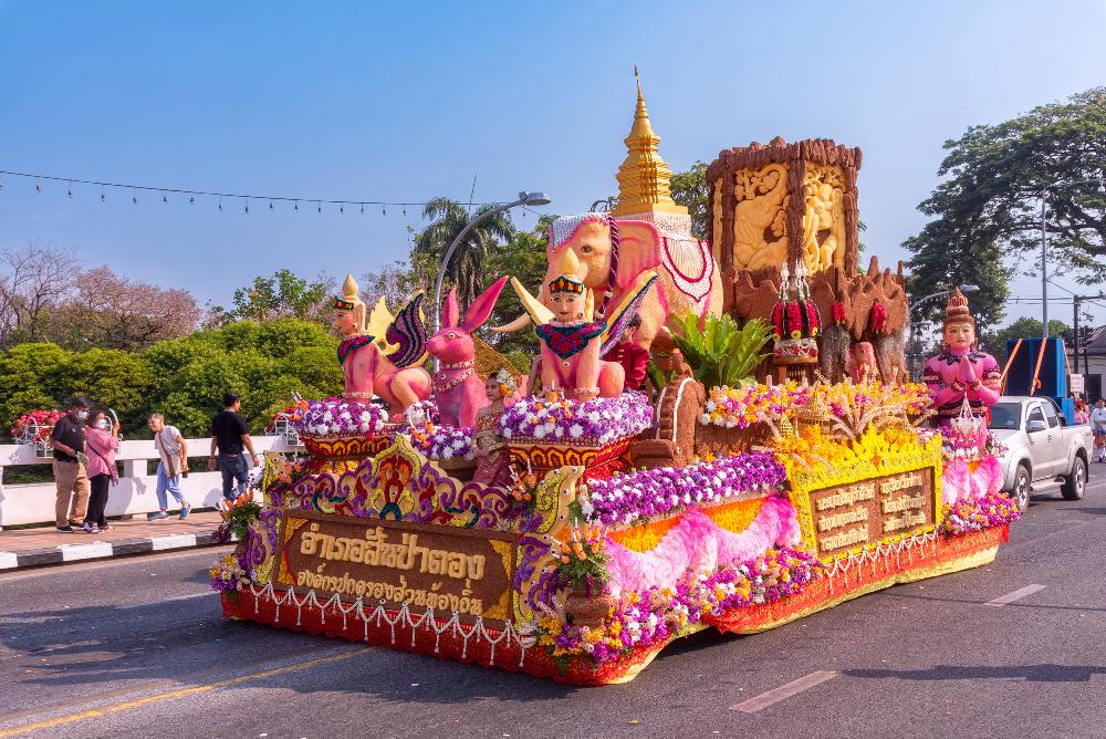 Die sensationelle Blumenparade steht im Mittelpunkt des Festivals. Sie präsentiert aufwendig gestaltete Wagen, die mit einer Unzahl von farbenprächtigen Blüten geschmückt sind. Der Anblick dieser floralen Wagen, die durch die Straßen gleiten, ist eine wahre Augenweide. Lokale Schulen, Gemeinschaftsgruppen und Unternehmen beteiligen sich mit Begeisterung und zeigen ihre Kreativität. Strahlende Schönheitsköniginnen, geschmückt mit blumigen Gewändern, verleihen den Prozessionen eine zusätzliche Eleganz.Diese werden durch eine Vielzahl von Marschkapellen, traditionellen Tänzern und Darstellern, darunter auch Schulkindern, ergänzt. Viele der Wagen zeigen buddhistische und typisch Chiang Mai-bezogene Themen. Sie werden zum Beispiel die farbenprächtigen Elefantenfiguren, die Sie je gesehen haben, nicht übersehen können. Alle Wagen treten in einem jährlichen Wettbewerb gegeneinander an.